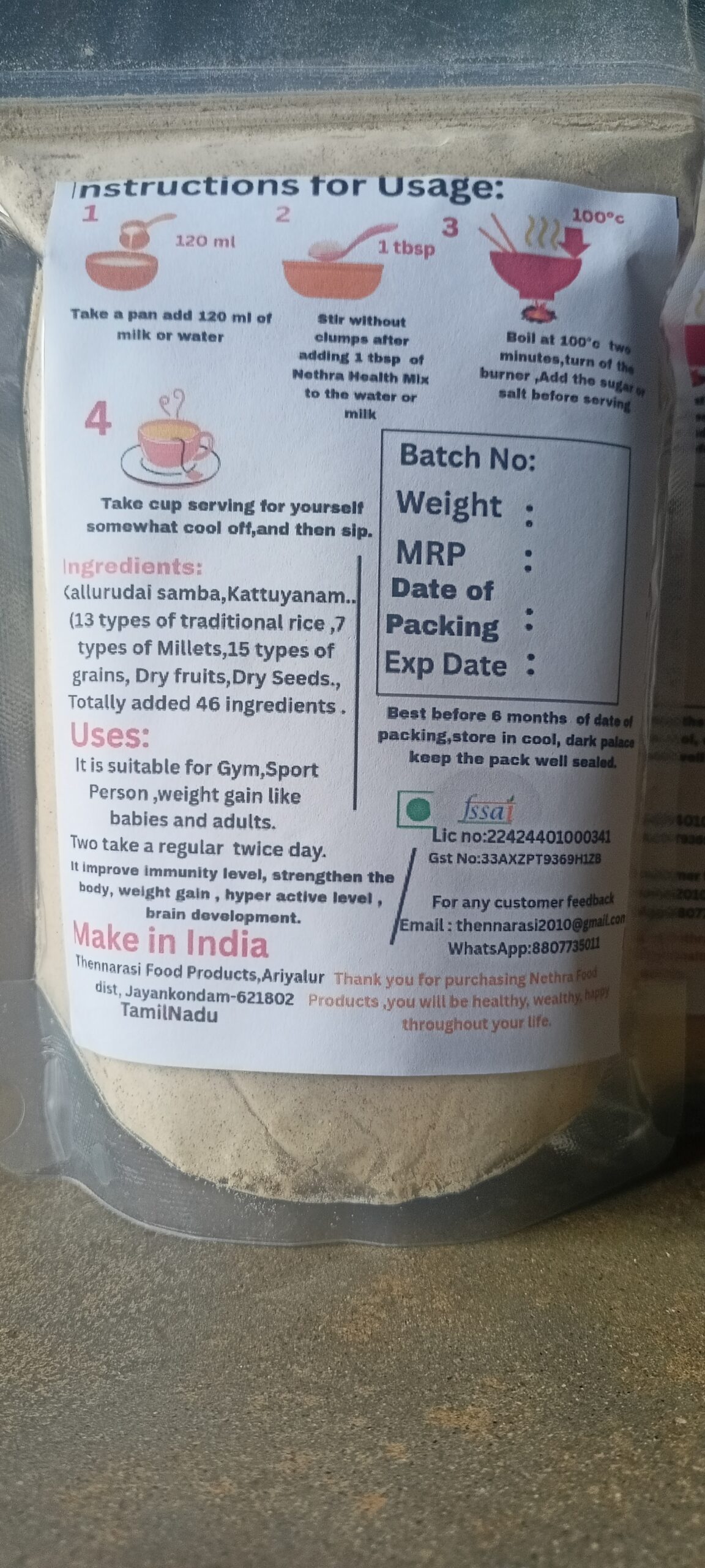 Containing a diverse selection of grains and pulses, Nethra Health Mix is designed to provide a variety of nutrients in one convenient product. With its protein-rich and fiber-packed ingredients, this mix supports energy levels and overall health. Whether you’re seeking a daily boost or looking to introduce more wholesome grains into your diet, Health Mix is a smart, nutritious choice.