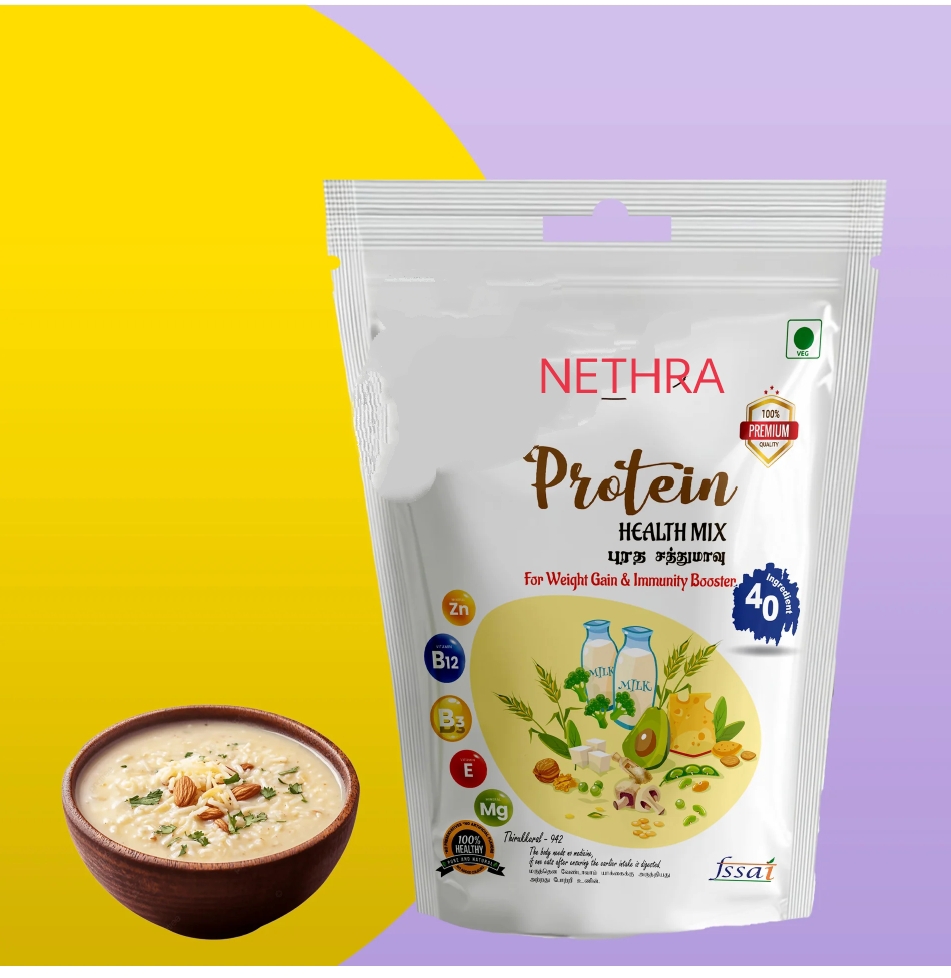 Nethra Health Mix is a nourishing combination of grains, pulses, and nuts, carefully crafted to support a healthy and balanced diet. This mix is rich in proteins, fiber, and essential nutrients, making it ideal for people of all ages. Whether you’re starting your day with a wholesome breakfast or looking for a quick and nutritious snack, Nethra Health Mix helps you meet your nutritional needs with ease.